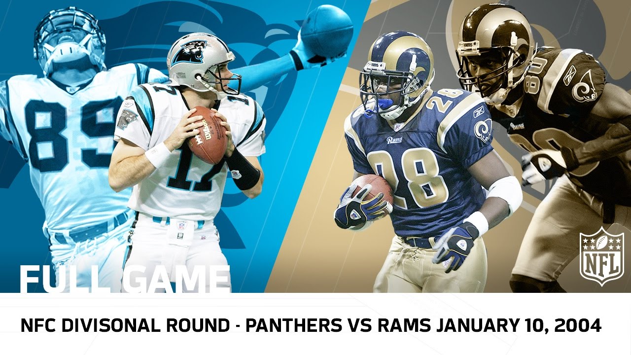 The NFC Divisional playoff matchup between the Panthers and Rams on January 10, 2004 was a four-hour-plus thriller at the rowdy Edward Jones Dome in St. Louis. In the first three quarters, the teams combined for seven field goals and Carolina led 16-12. A Panthers touchdown with 8:50 left in the fourth quarter extended their lead to 11. When the Rams scored on a Marshall Faulk touchdown run with under three minutes left, it felt like it was too-little, too-late for St. Louis. The Rams had just one timeout remaining. But then things got wild: the Rams converted on the two-point conversion – and recovered the onside kick. Several plays later, the Rams’ Jeff Wilkins kicked a 33-yard field goal to force overtime. On its first possession, Carolina’s John Kasay made a 40-yard field goal that appeared to win the game – but it didn’t count due to a delay of game penalty, and Kasay missed a follow-up 45-yarder. The Rams missed their own field goal attempt of 53 yards. Then in the second overtime, on a 3rd-and-14, Panthers quarterback Jake Delhomme and receiver Steve Smith – on a play known as “X-Clown” – connected on a 69-yard touchdown that won the game, 29-23. The next week, Carolina won the NFC championship. ― NFL 100